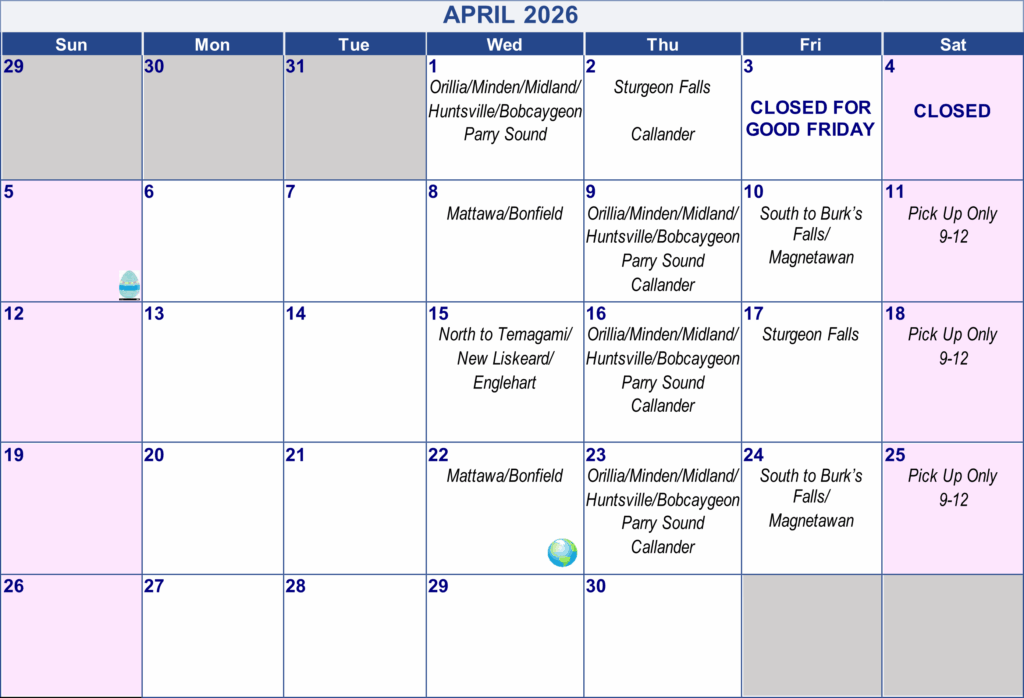 - Delivery to Mattawa and Bonfield every second Wednesday