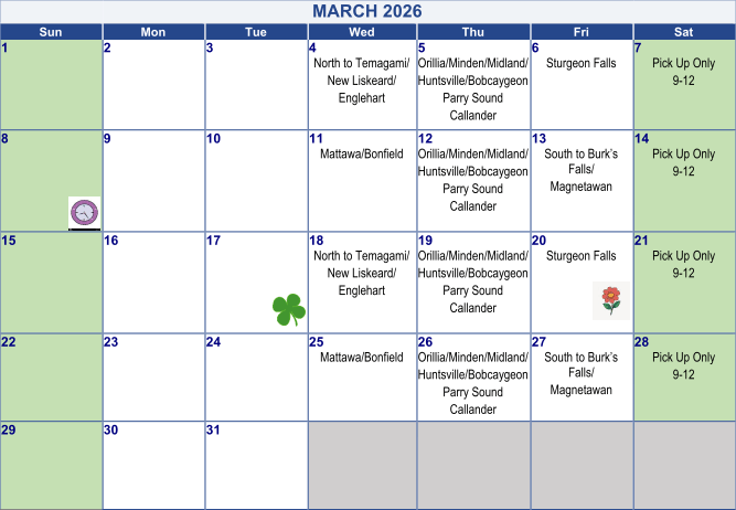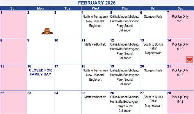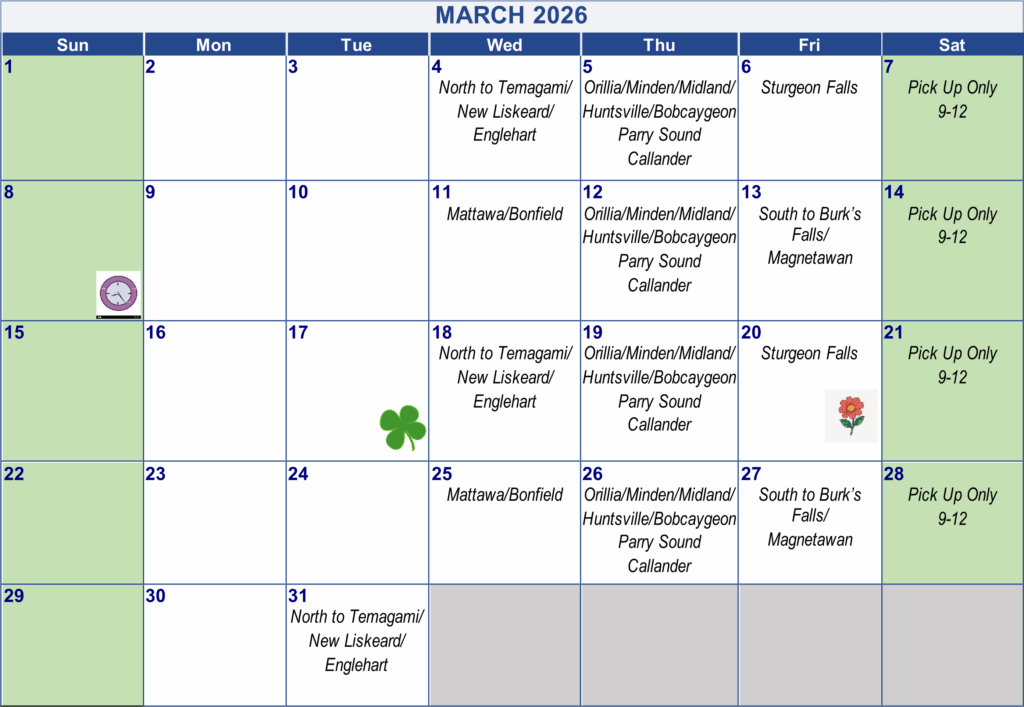 - Delivery along the Hwy 11S corridor to Burks Falls/Magnetewan every second Friday