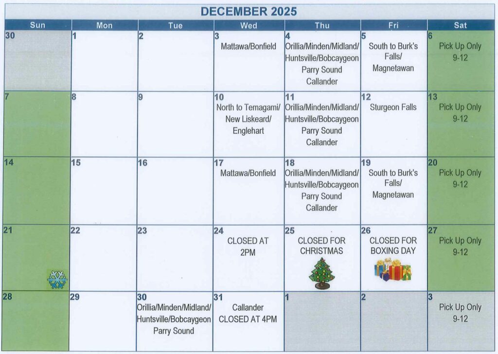 - Delivery to Mattawa and Bonfield every second Wednesday